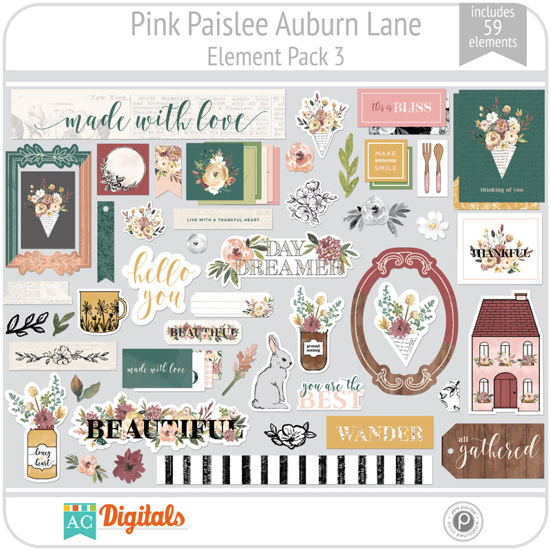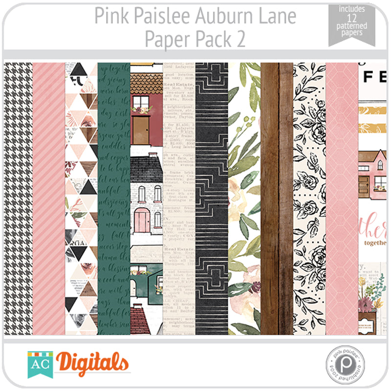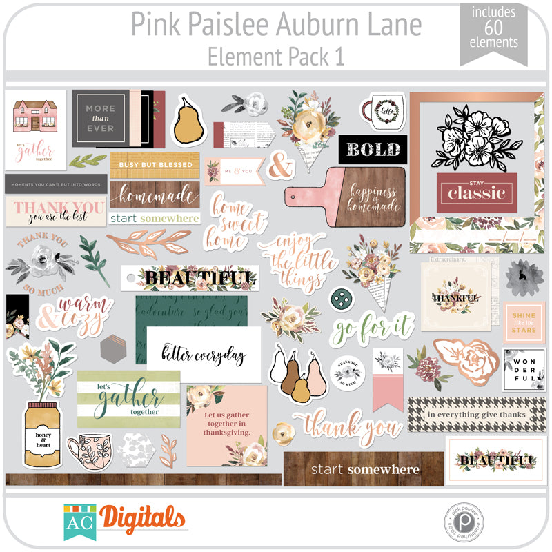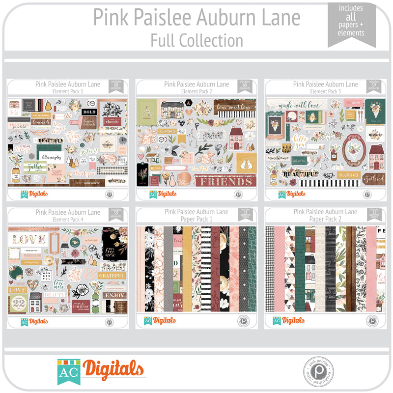 Classic black-and-white film meets quaint New England garden in Pink Paislee's collection, Auburn Lane. Black and white, plus a limited color palette, give clarity and structure, while warm wood tones and copper accents provide a cozy, fall richness. Sophisticated typography and memorable florals have an endearing and playful autumn twist. And inked line work, newsprint, and textures make this collection beautiful, elegant, and unique.