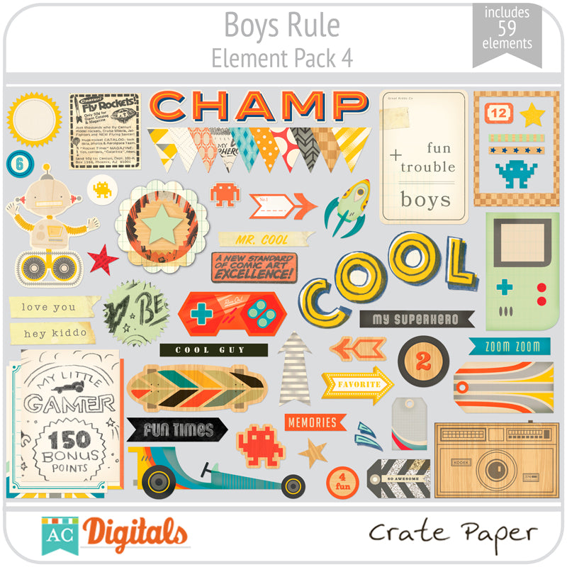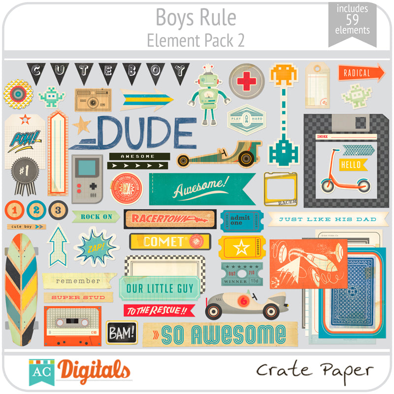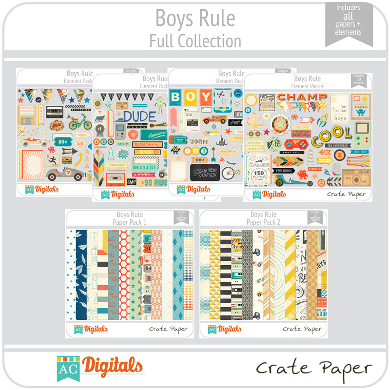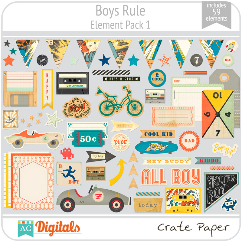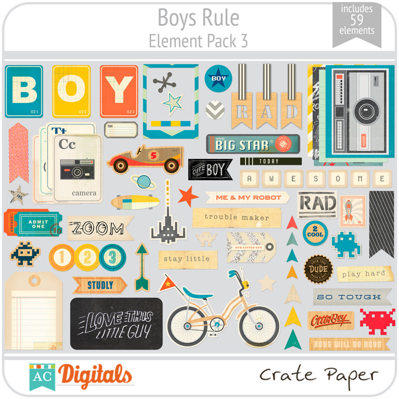 Boys Rule! This collection is full of eclectic icons that will make your next boy layout or project a big hit! Boys Rule is so versatile and is perfect for any age. It works for baby boys all the way up to those college boys that love to skateboard, game and everything in between. Enjoy the new Boys Rule collection, but be prepared — it is so inspiring that you may have the need to play some video games after. :)