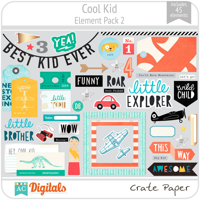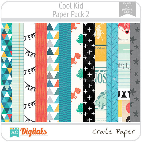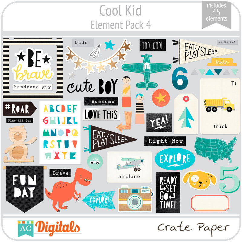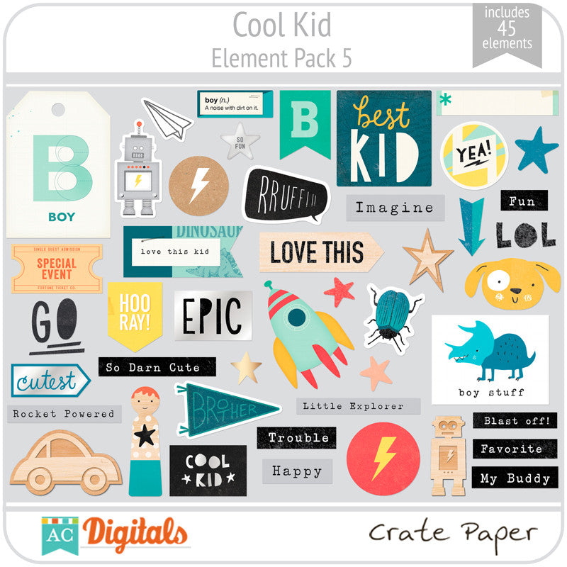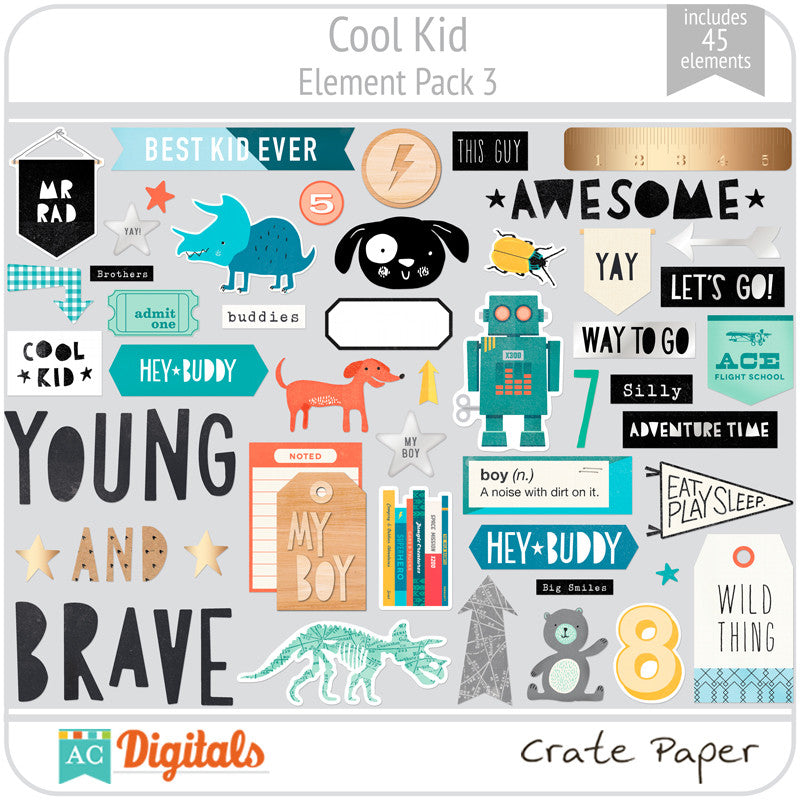 Cool Kid is perfect for boys of any age and has a trendy color palette that is full of fun, adorable paper and great embellishments. It highlights the awesomeness that is your little dude with rad icons, cool critters, fun phrases, and metallic silver accents. Enjoy Cool Kid and be prepared: you're going to want to get your hands on this collection. It's pretty cool!