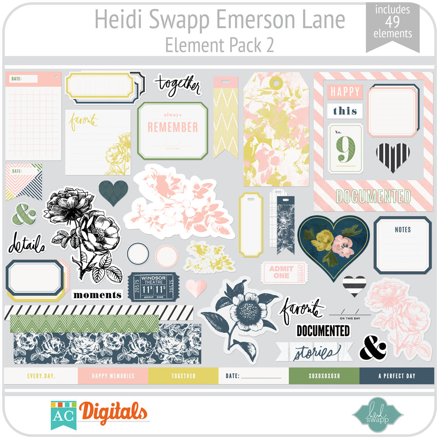 Beautiful florals, delicate details, and gold accents make their way into Emerson Lane, a collection from Heidi Swapp! With black and white patterns with soft greens, pinks, and yellows in these patterned papers and embellishments, the possibilities are endless!