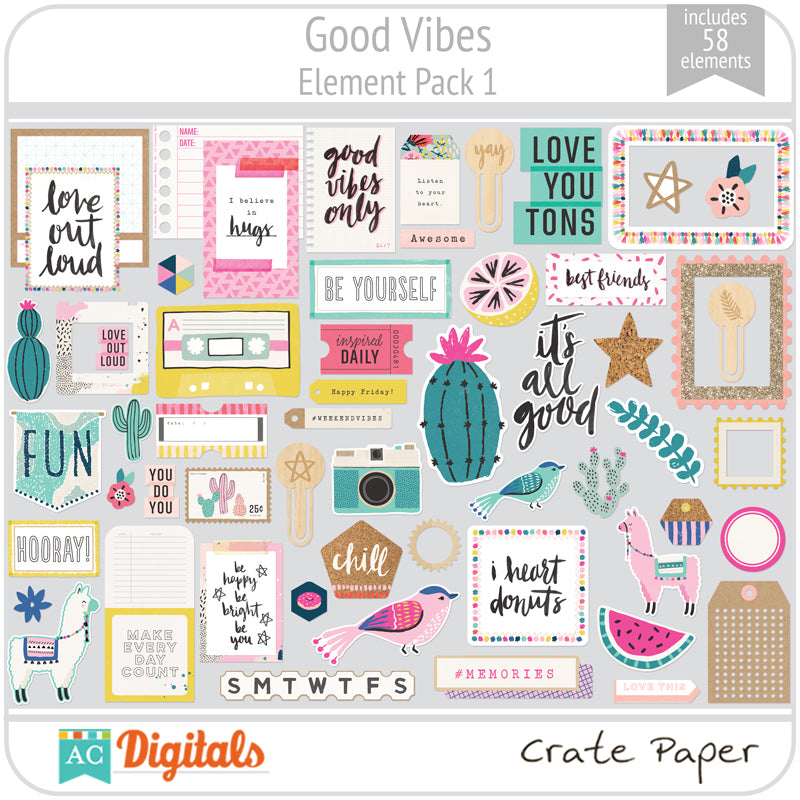 Capture carefree adventures with Good Vibes by Crate Paper! This everyday collection features bold teals and pinks mixed with soft kraft, cork, and light wood neutrals. Patterned paper and embellishments feature handwritten phrases and trendy icons to brighten your happy memories. Bring good vibes to your next scrapbook layout, card, or home decor project!