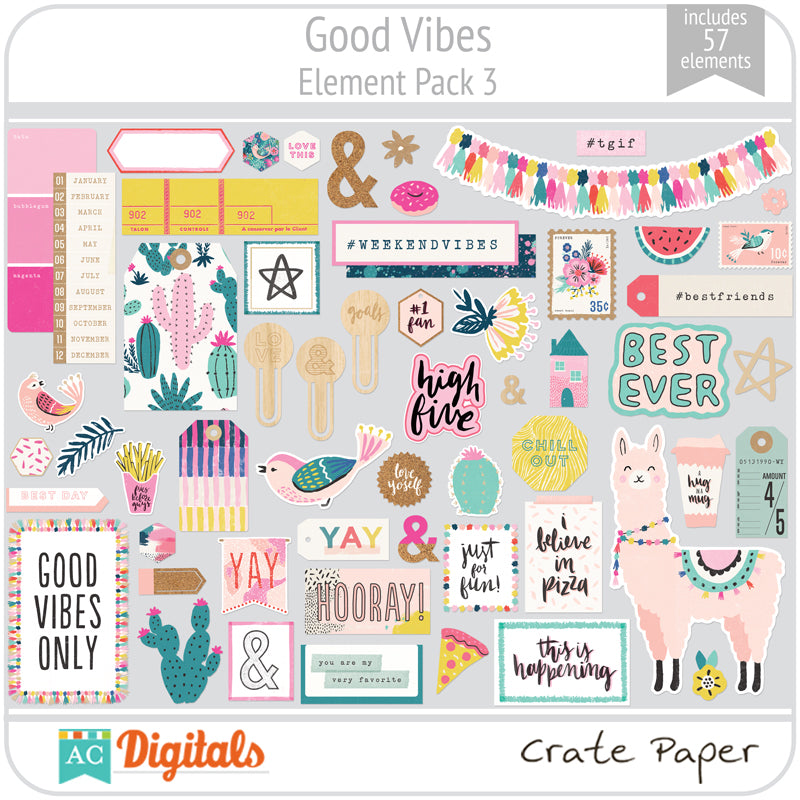 Capture carefree adventures with Good Vibes by Crate Paper! This everyday collection features bold teals and pinks mixed with soft kraft, cork, and light wood neutrals. Patterned paper and embellishments feature handwritten phrases and trendy icons to brighten your happy memories. Bring good vibes to your next scrapbook layout, card, or home decor project!