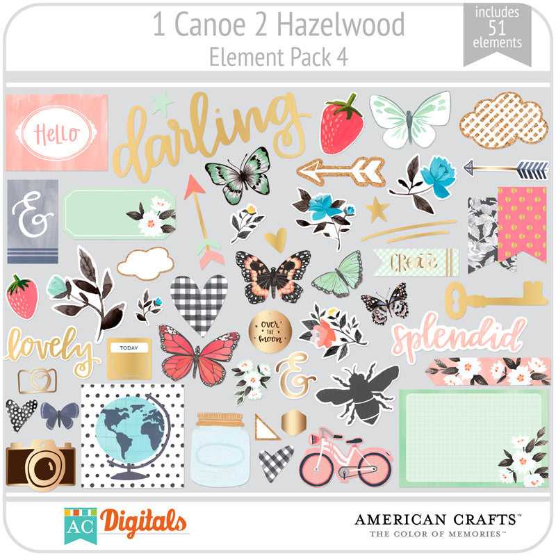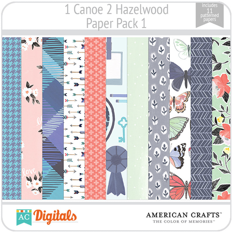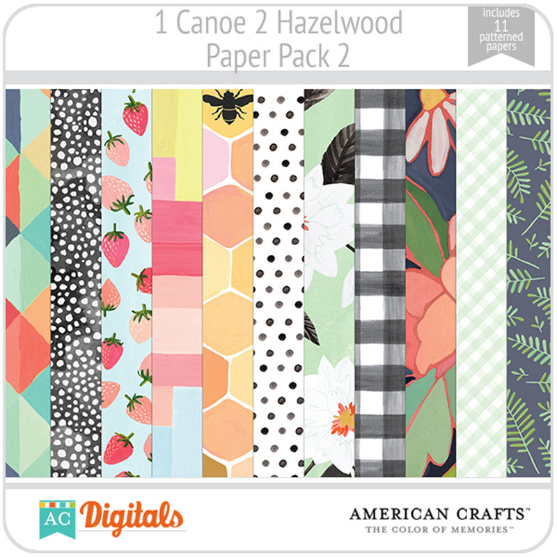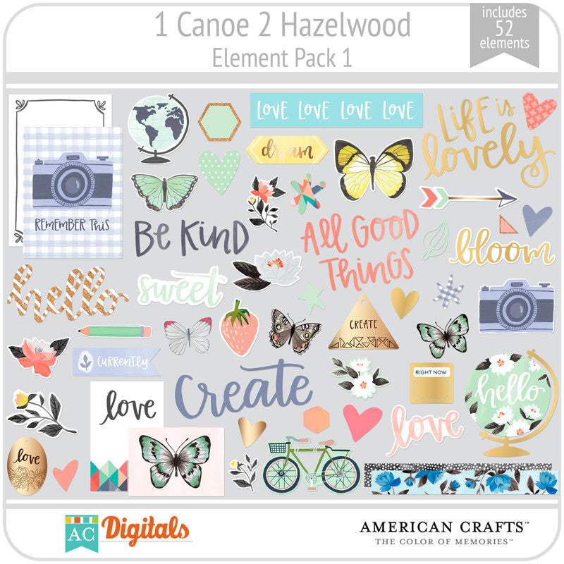 Hand painted florals in a fresh color palette highlight the debut paper crafting collection by 1canoe2 and American Crafts. This collaboration highlights the heartfelt sentiments of the handmade and hand drawn. The Hazelwood collection showcases the simple comforts in life and is accented by sophisticated hand lettering. Create stunning paper projects with an assortment of versatile embellishments in a pleasing palette of delightful mint, honeycomb yellow, and pale pink.
