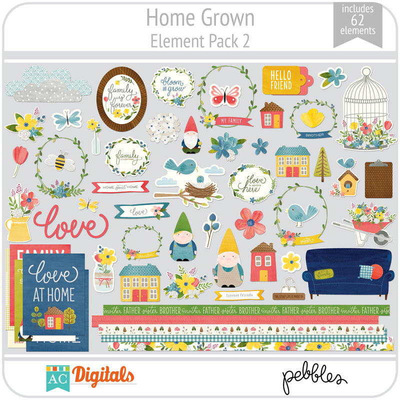Experience the joys of home and happy outdoor memories with Pebbles’ collection, Home Grown. Soak up the organic color palette of sunflower yellow, cherry red and deep chestnut with accents of sweet spring pastels. Enjoy the happiness of home and family with hand-drawn icons of sweet birds, busy bees & butterflies, and sprightly garden gnomes.