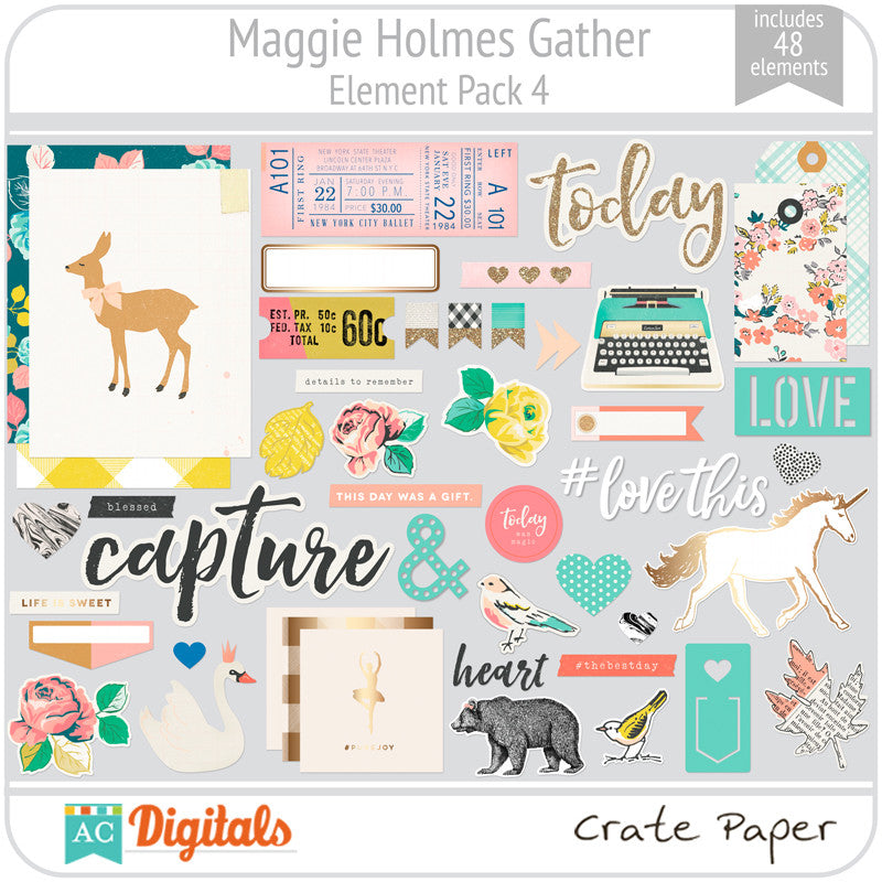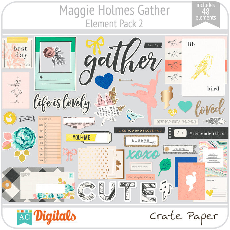Gather is a collection all about gathering your loved ones around and celebrating life while collecting and recording your favorite memories and all of your happy little moments. Full of cameras, hearts, bows, and birds, and of course, flowers, plus touches of vintage inspired ephemera, labels, and phrase stickers that you'll love!
