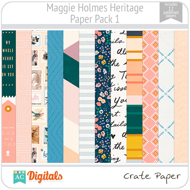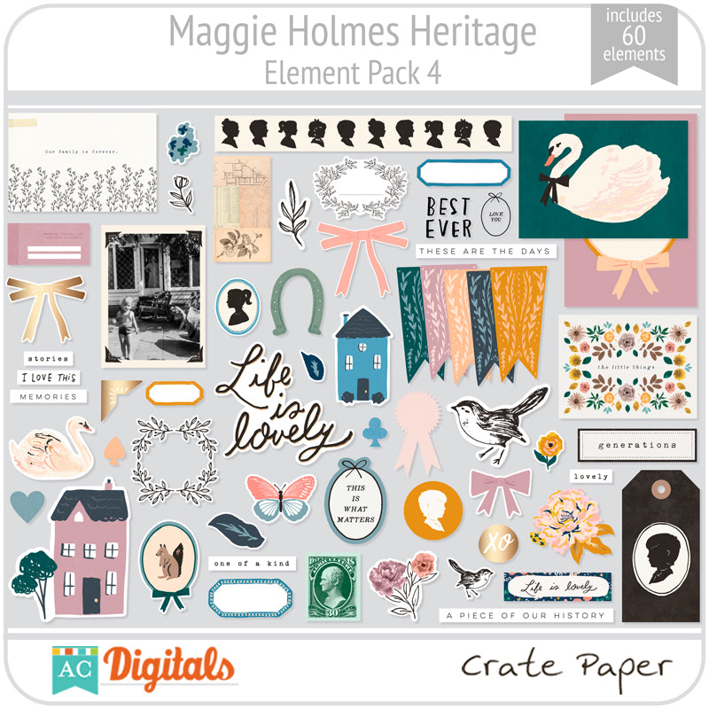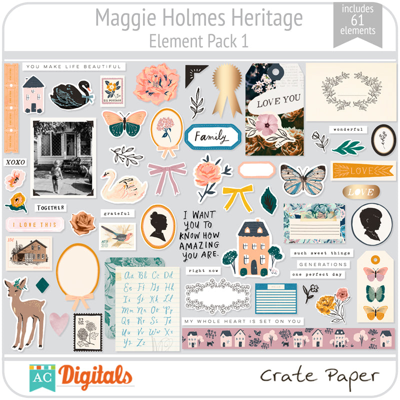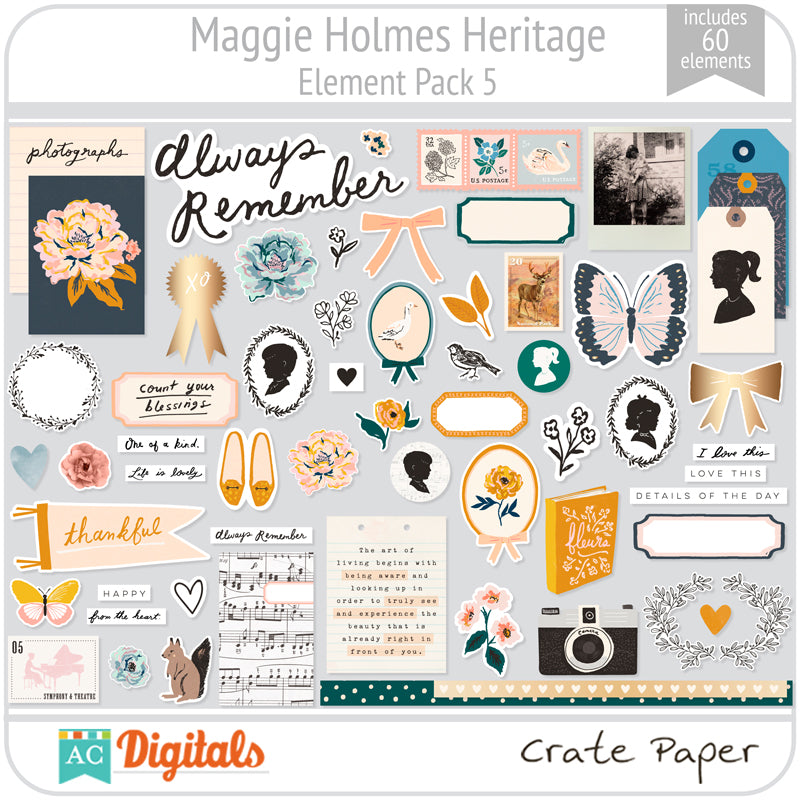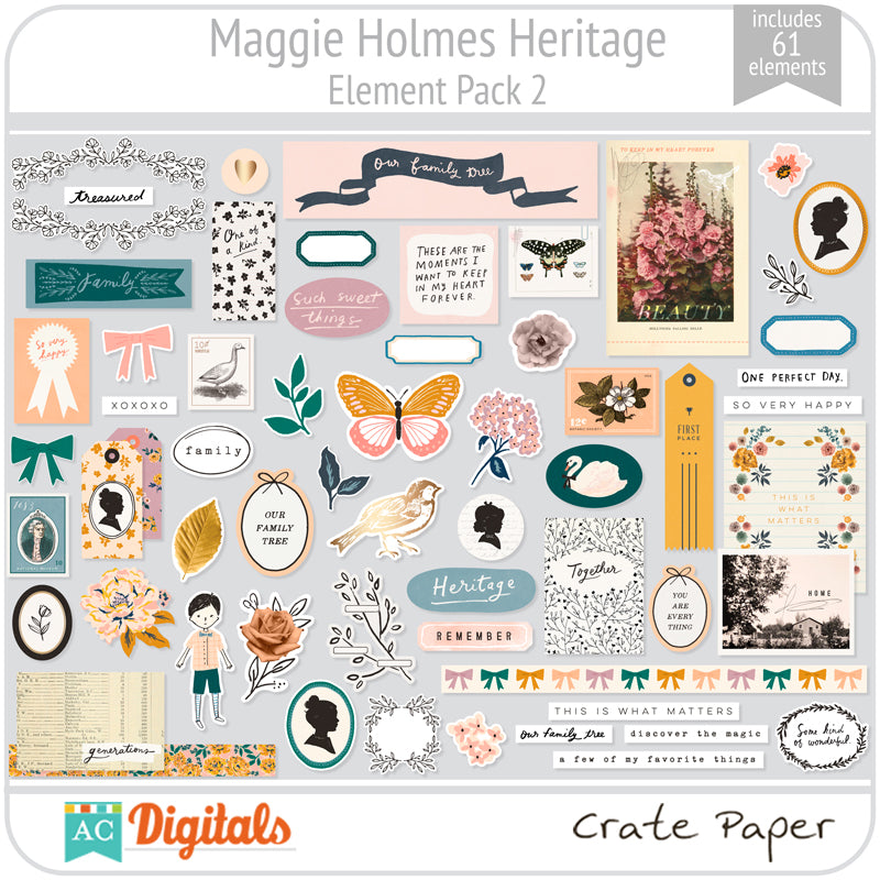 Celebrate your story with Heritage by Maggie Holmes. Soft golds, purples, pinks, and blues come in delicate, nostalgic hues to complement rustic icons and patterns. Dainty woodland flora and fauna pair well with sentimental portraits and antique collectibles. And sweet, romantic homes remind us of the unique heritage we've each been given.