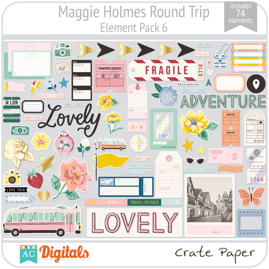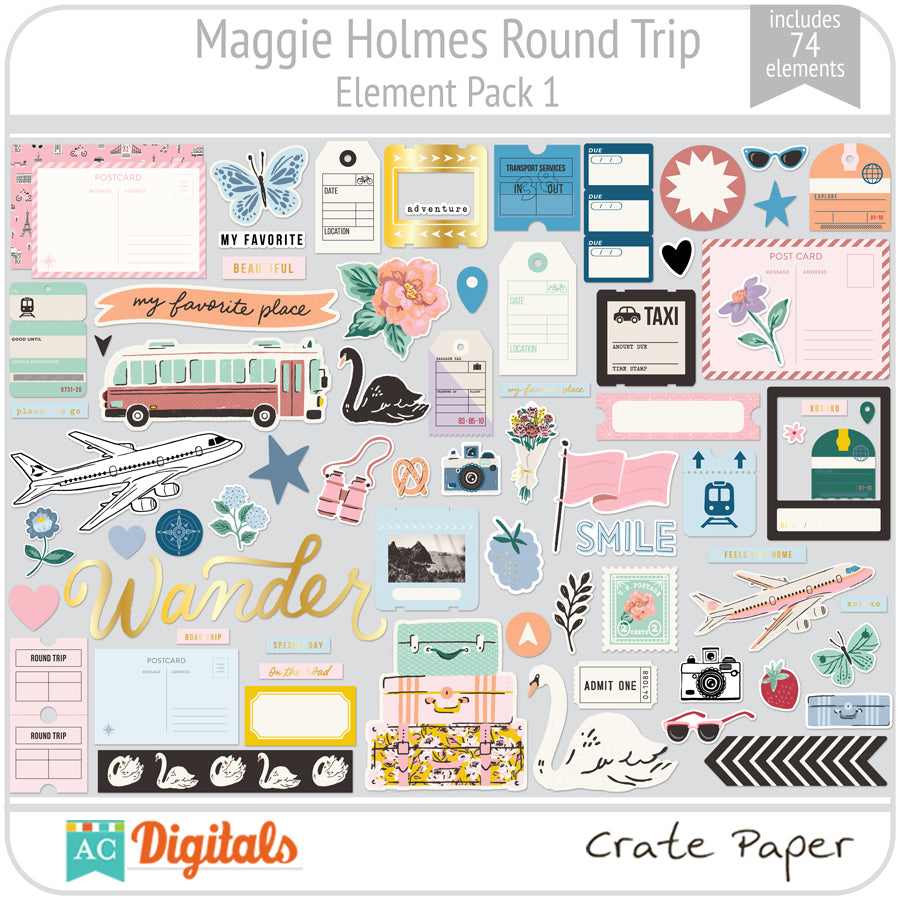 Maggie Holmes Round Trip is an everyday collection for the world traveler at heart! It features lots of darling travel icons to help you collect your memories whether near or far. I know we are not all back to traveling yet, but if you are like me, you have plenty of photos from previous vacations that haven't been properly documented yet. This new collection of products is perfect for pulling out those images and making some scrapbook pages or a cute mini album!