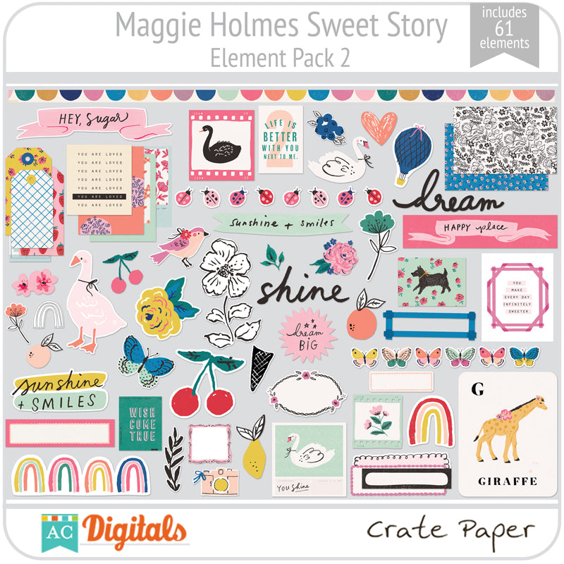 This collection from Maggie Holmes and Crate Paper celebrates all things sweet and whimsical in life! It's full of bright bold colors, sweet treats and the cutest playful animals! With this collection, you can share your memories and stories in the sweetest way!