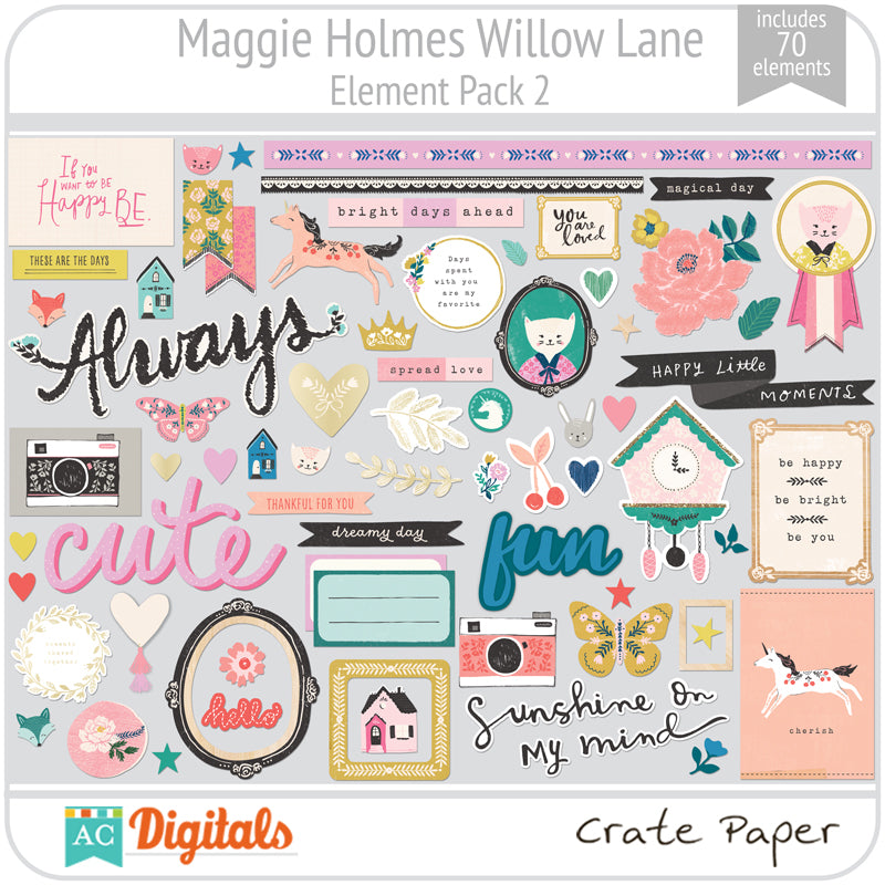 Enter a whimsical dreamland with Willow Lane by Maggie Holmes for Crate Paper. A perfect pastel color palette of teals, pinks, blues, and yellows complements quaint characters like foxes and pandas. Fanciful florals and lovely handwritten phrases add a sophisticated touch, while colorful houses give your projects a romantic, charming feel.