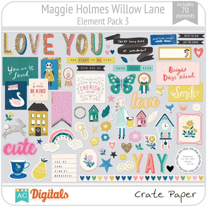 Enter a whimsical dreamland with Willow Lane by Maggie Holmes for Crate Paper. A perfect pastel color palette of teals, pinks, blues, and yellows complements quaint characters like foxes and pandas. Fanciful florals and lovely handwritten phrases add a sophisticated touch, while colorful houses give your projects a romantic, charming feel.