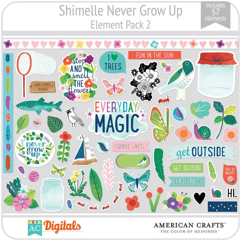 Youth knows no age in Shimelle's whimsical collection, Never Grow Up. Happy florals come to life in a bright rainbow color palette, and playful icons like marbles, crawling critters, and hopping frogs bring back sweet childhood memories. A loose, hand drawn illustration style combines with silver foil accents and wood veneer embellishments to bring a special childlike magic to the simple joys of life. And cheerful quotes show the bright side of things and remind us to Never Grow Up.
