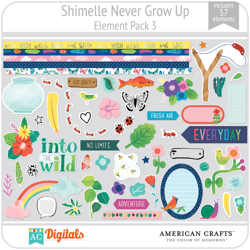 Youth knows no age in Shimelle's whimsical collection, Never Grow Up. Happy florals come to life in a bright rainbow color palette, and playful icons like marbles, crawling critters, and hopping frogs bring back sweet childhood memories. A loose, hand drawn illustration style combines with silver foil accents and wood veneer embellishments to bring a special childlike magic to the simple joys of life. And cheerful quotes show the bright side of things and remind us to Never Grow Up.
