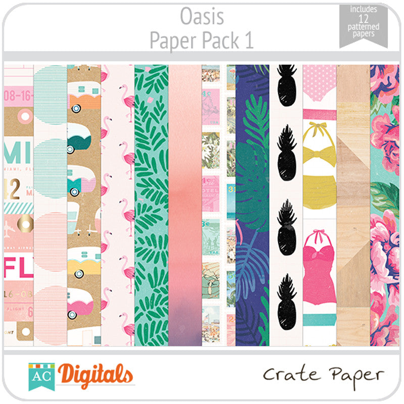 Delight in carefree, sunshine-filled moments with the Oasis collection. Capture weekend getaways or everyday fun in the sun with this colorful collection of patterned papers and coordinating embellishments. Create pretty paper projects with a mix of retro & modern graphics and patterns. Images of pineapple, flamingos, & palm leaves are joined by colorful phrases for a bright, fun collection!