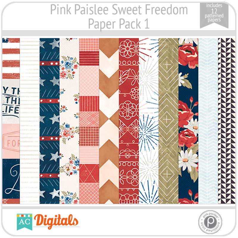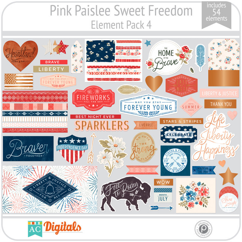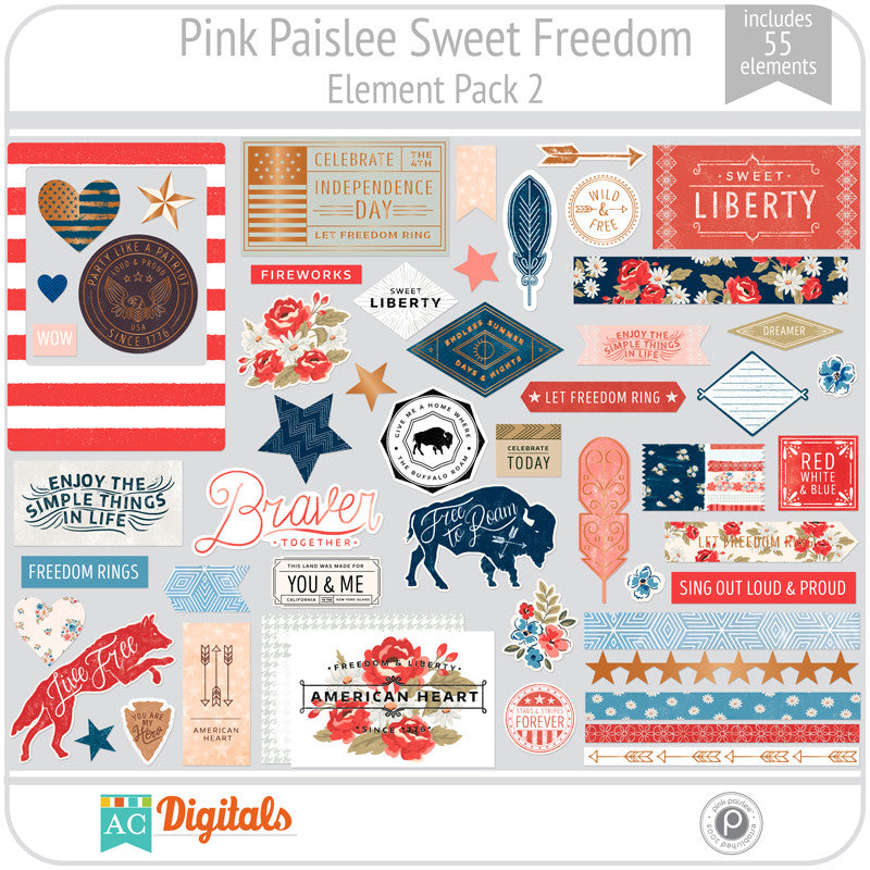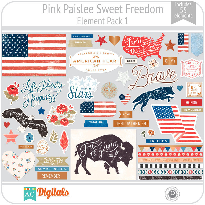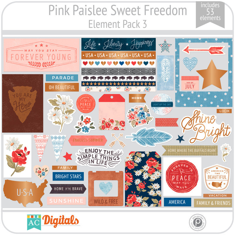 Let your free spirit take flight and capture your favorite summer memories with Sweet Freedom. Stars and stripes, fireworks and other patriotic elements are displayed in a faded color palette of red, white, and blue paired with warm earth tones. Distressed textures, leather, and copper add an old world feel to this on-trend collection.
